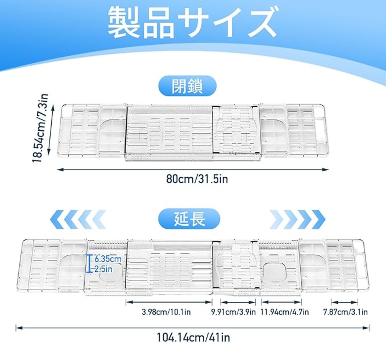 【伸縮式で幅調整可能】55~80cmのフレキシブル設計、日本住宅の狭い浴槽にもピッタリサイズ。伸縮式レールで55cm~80cmまで自由調整でき、賃貸・戸建て問わず設置可能。軽量643gで女性でも簡単に移動でき、収納時もコンパクト(折りたたみ時17.5 56.5cm)。