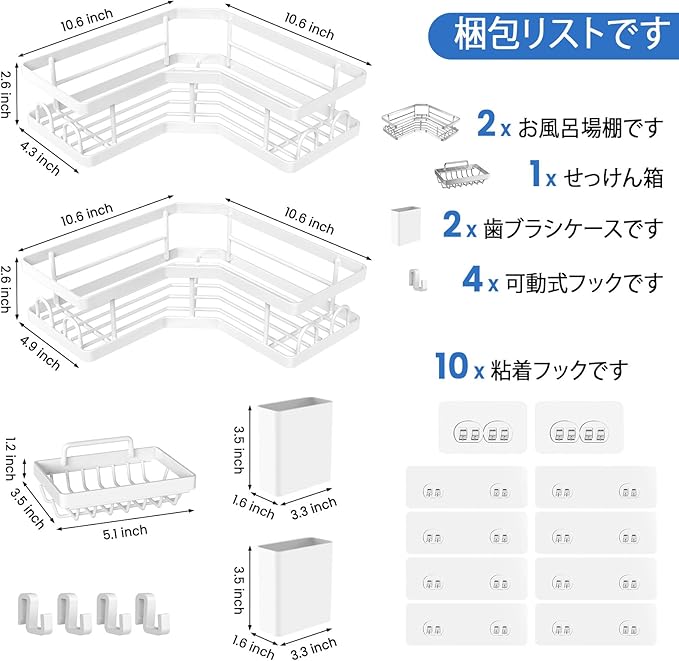 【製品に含まれます】ラック x 2,せっけん棚x 1,です粘着テープ x 10,歯ブラシ立てですx 2,フックですx 4,マニュアル x 1,温かいカスタマーサービス。