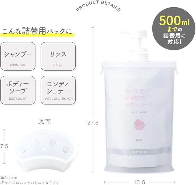 詰替用の袋ごとスッポリ! シャンプ―などの詰替に便利なディスペンサー。省スペースで持ちやすいスリムボトルです。500mlまでの詰替え用に対応しています。