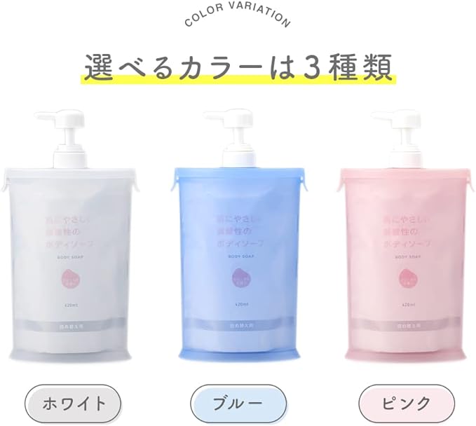 【商品仕様】セット内容/3色セット(ホワイト・ピンク・ブルー)、商品サイズ/(約)7.5 15.5 26cm、使用時サイズ/(約)7.5 15.5 27.5cm、材質・成分/本体:ポリプロピレン、ポンプ:ポリプロピレン