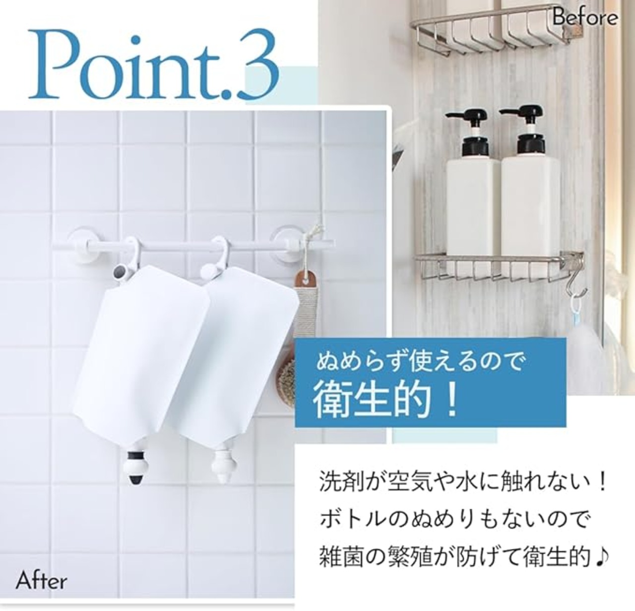 【注意】 ポンプのみの商品となりますので、ホルダーは別売りです。 今まで面倒だった詰め替え作業がなくなりました。 詰め替えパックを簡単セットするだけでそのまま使えます。 シャンプーリンスなどの詰め替えパックに取り付けることで使用することができます。 逆止弁構造で、空気の逆流を防ぎ酸化防止になります。 真空状態を保つことで、雑菌の繁殖を防ぎます。 ぶら下げて使うことで、最後の最後まで洗剤を使えます。 ■特長 ・ホルダーとポンプを詰め替えパックにセットするだけで、そのまま使用できます。 ・今まで面倒だった詰め替え作業がないので、取り付けたらそのままサッと使用できます。 ・ボトルを使わなくてすむので、お風呂場がスッキリします。 ・詰め替えの手間(洗浄・乾燥・補充)がない。 ・取り付け、取り外しは、簡単ワンタッチ。・片手で適量が抽出でき、赤ちゃんとの入浴時にも便利です。 ■使用方法 (1)詰め替え用パックの出口を1.5〜2cmの幅になるようにカットします。 (2)レバーを開いたポンプを根元までしっかり差し込んでください。 (3)レバーを閉じて固定します。 (4)ホルダーのスライダーを手前に引き、詰め替えパックの端をはさんで 再びスライダーを押して固定して吊るすだけ。 (5)ポンプを押して使用できます。 ■ポンプのクリーニング方法 ・中身が出にくくなった場合はリセットピンを爪先で軽く引きます。 ・別の中身に詰め替える場合はクリップ部をポンプから外し、ぬるま湯の中で数回押して洗います。 ■ご注意 ・本品の破損防止の為、本来の用途以外に使用しないで下さい。 ・クリップ部で詰め替えパック以外のものを挟まないで下さい。 ・詰め替えパックの材質、厚み、形状が特殊な場合クリップ部とスキが生じ中身が漏れることがあります。 ・ポンプをセットした後のパックには、無理な圧力をかけないで下さい。 ・ホルダーに取り付けた詰め替えパックには、無理な荷重をかけないで下さい。 ・床に落とすと、本体が破損する場合があります。 ・幼児の手の届かない所に保管して下さい。 ※本製品をご使用になれない詰め替えパックが一部あります。 ※ご購入の際は、ご使用予定の詰め替えパックの形状をご確認ください。 ご使用になれない詰め替えパック (1)注ぎ口をカットした際、開口部が20mm以上になる詰め替えパック。 (2)材質や厚みが通常と大きく異なる詰め替えパック。 (3)注ぎ口が凹凸形状の詰め替えパック。 ■よくある質問■ ミニシリーズとスタンダードシリーズとの違いについて ■抽出量が違います ミニシリーズは3~4ml スタンダードは5~6ml ■洗剤パックの固定方法が違います ミニシリーズはニードルで詰め替えパックに刺して固定します。 スタンダードはSUSのギザギザローラーで詰め替えパックを挟んで固定します。