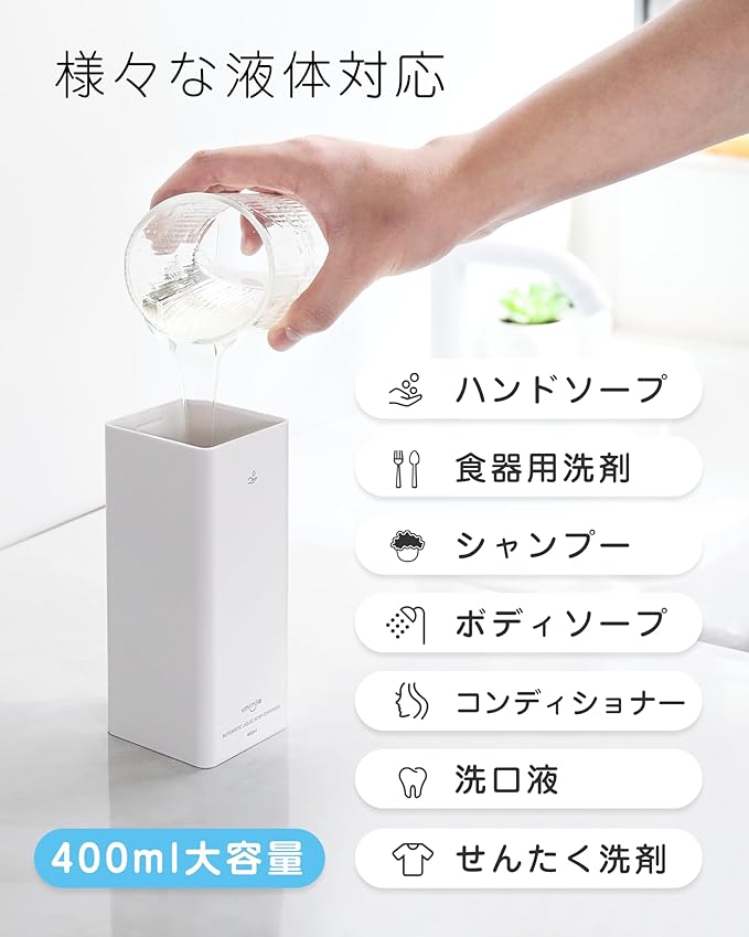 【様々なシーンで活躍】5種類のシールが付いておりますので、ご要望に合わせて容器に貼ってお使いいただけます。清潔感のあるホワイト、スタイリッシュなブラックの2色からバスルームの雰囲気に合わせてお選びいただけます。据え置き型だけでなく壁掛け型や両方で使えてバスルームをスッキリ収納させることができます。(※黒いスポンジなど深色のものを使うと、センサーが反応しなくなる恐れがあります。色味を変えてお使い下さい。)