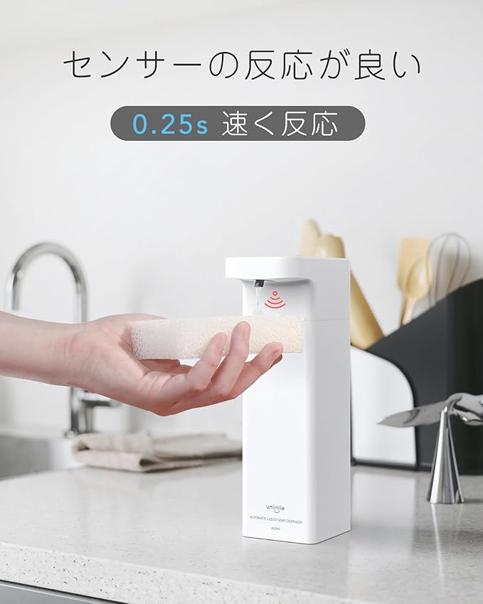 【自動ソープディスペンサー 液体】料理中、ベタベタの手でポンプをプッシュするのがストレスでした。キッチンには食器洗剤を入れて、スポンジをかざすだけで定量が出るのでとても楽。シーンに合わせてソープの量は三段階に調節ができるので使いすぎの予防になります。