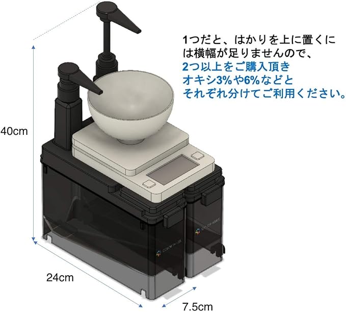 美容室やカラーリング専門店向け。カラー剤で汚れた手袋をつけてても周囲を汚さず素早く約10gずつオキシ/カラー剤2液を出すことができます。1gずつの微調整も簡単です。液体を移し変えてお使いください。1.5L入ります。2つ以上ご購入頂き(1つだけですと、はかりを上に乗せるには横幅が狭いです)、横に並べてはかりとカップを上に乗せてお使い下さい。