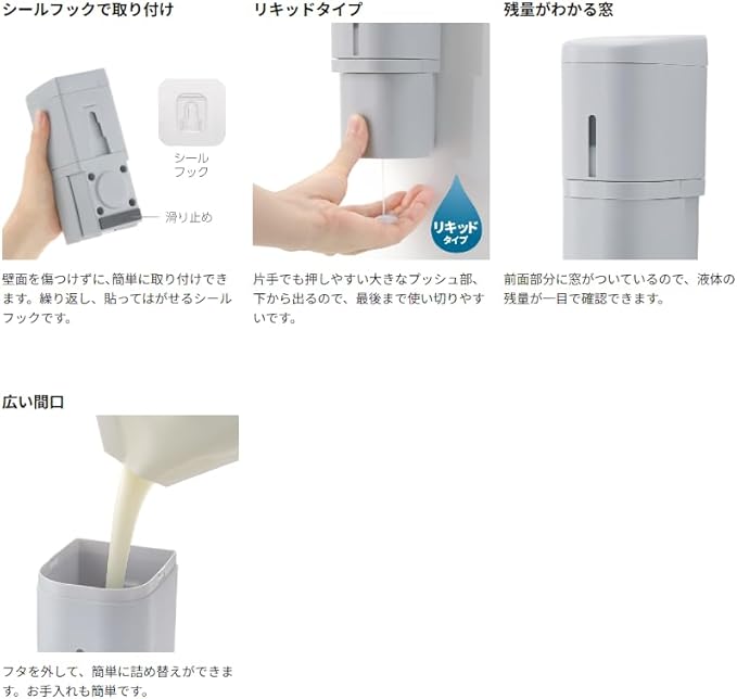 リッチェル(Richell) はがせるタイプ ホバー シールフックディスペンサー 250 ホワイト 1個 110030 ディスペンサー 詰め替え 押しやすい 下から出る お風呂 浮かせる 収納 片手 粘着 プラスチック サイズ/6.6 8 15.7H(cm) 容量/250mL 材質/ポリプロピレン他 耐荷重/1kg | KAZESHOP