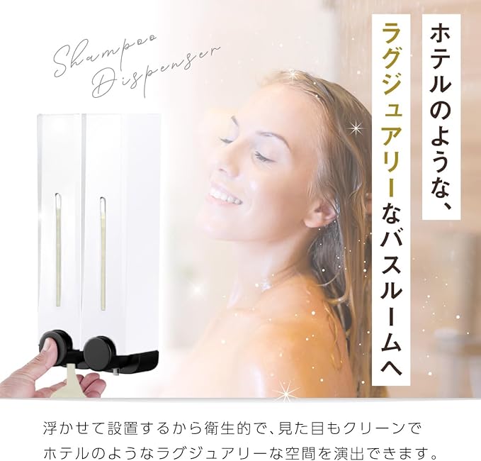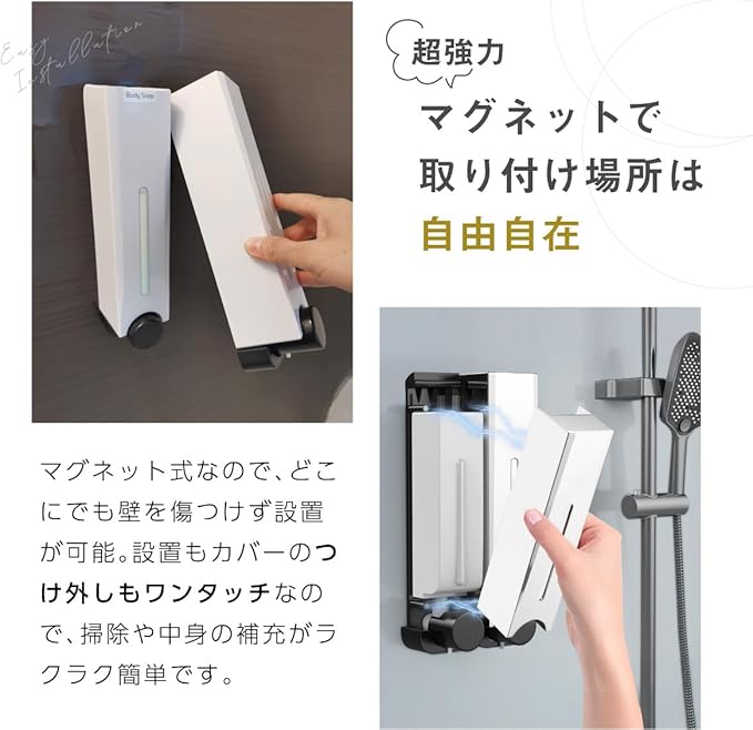 ✨床に置かないシャンプーボトル 壁にマグネットで貼り付けて浴室をすっきりスマートにできる便利なシャンプーディスペンサー。あのイヤなヌメりから開放されるので、毎日のバスライフが清潔で気持ちが良いものになります。お掃除も楽々で日々のストレスが軽減しますね。