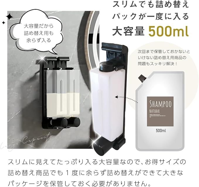 ✨タンクは大容量500mlのため市販の大半の詰め替え用が一度に入ります。 あと少しが入りきらずに詰め替えを残しておく煩わしさがありません。