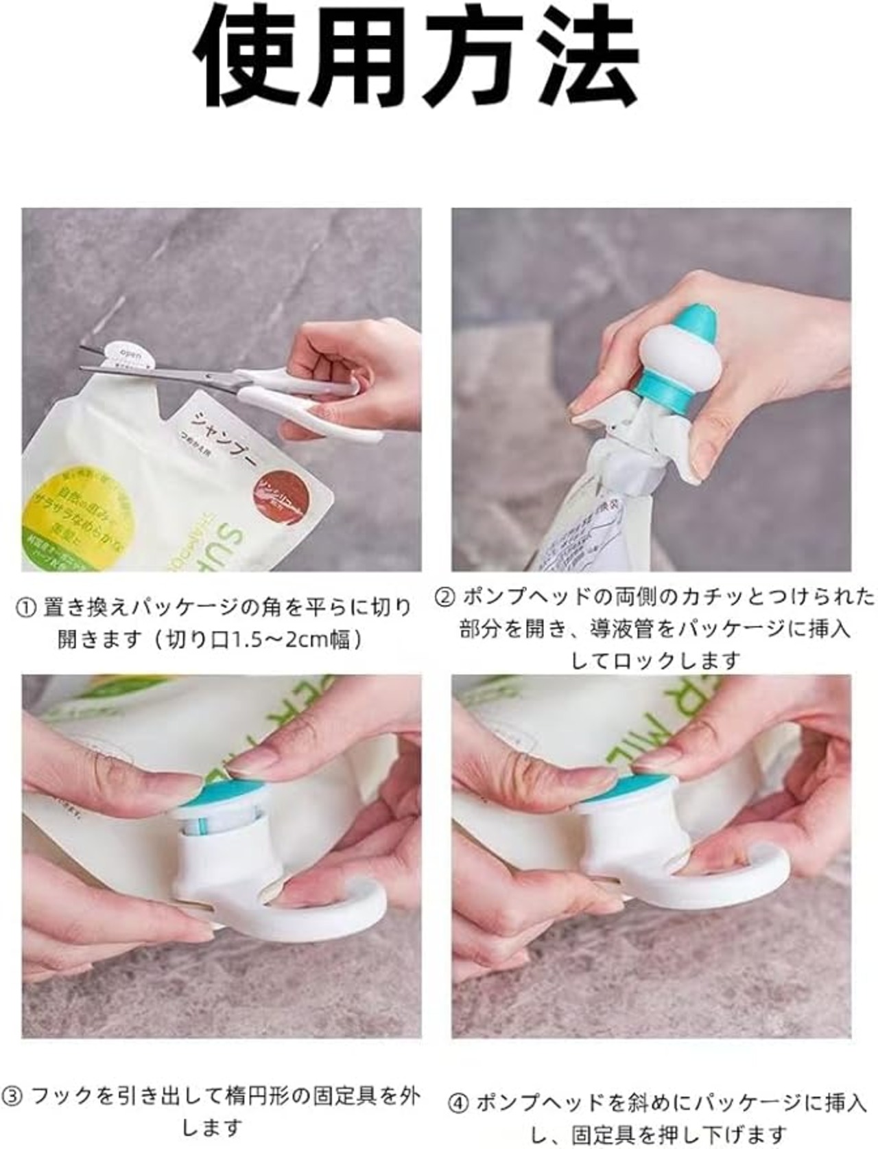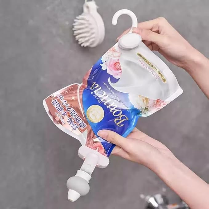 【簡単便利】 面倒な詰め替え作業不要。 詰め替えパックを簡単セットするだけでそのまま使える。 シャンプーリンスなどの詰め替えパックに取り付けることで使用することができる。