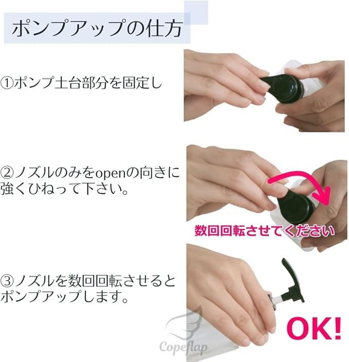 ※お使いいただく前に・・※ポンプアップするには、ポンプ土台部分を固定し、ノズルのみをOPENの向きに強くひねってください。少々きつく締められている場合がございます。
