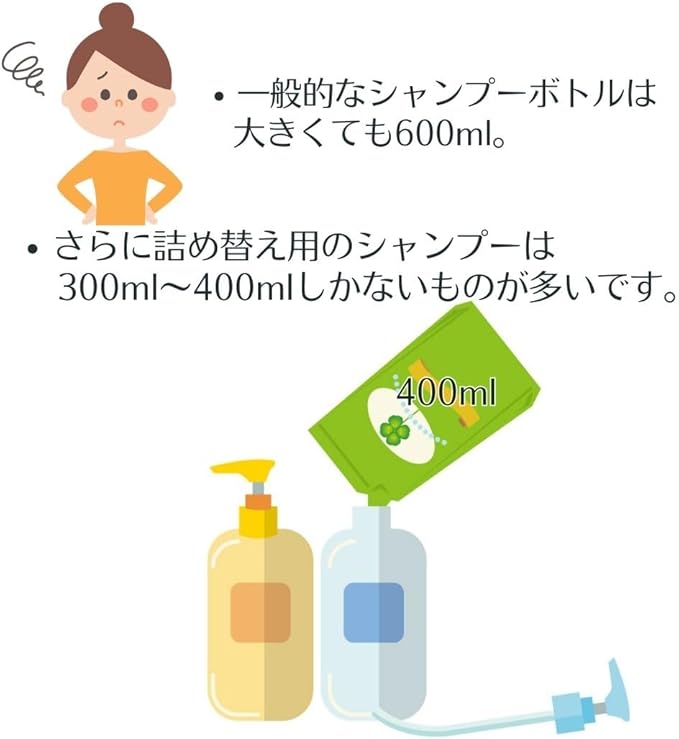 シャンプー、コンディショナー、ボディソープ用など用途別に色分けが出来ます。クリアなのでどのくらい入っているかも一目瞭然です。