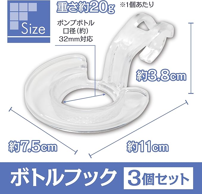 【サイズ(約)】7.5 11 3.8cm 【重量(約)】20g 【材質】PC 【耐荷重(約)】800g 【取り付けバーサイズ(約)】直径20mm対応 【ボトルポンプ口径サイズ(約)】直径32mm対応 【カラー】クリア 【入数】3個 【生産国】中国