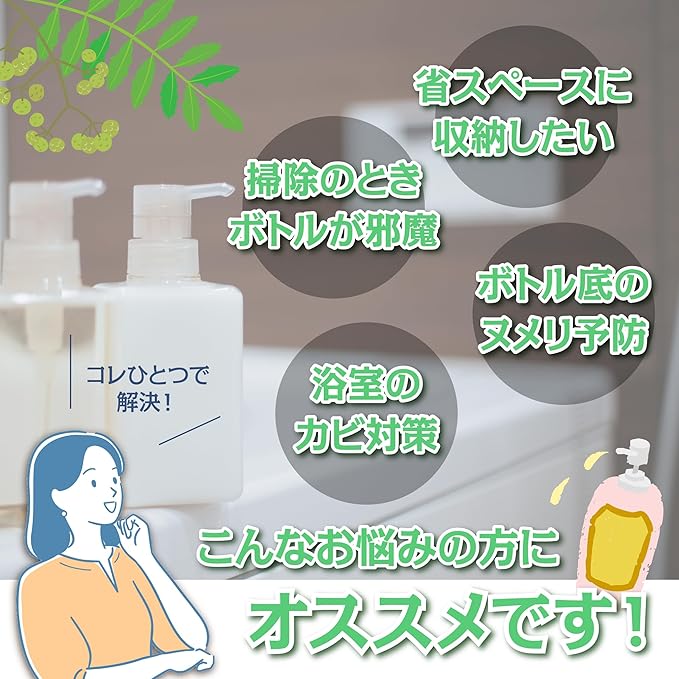 【ボトルのお悩みもコレで解決!】ボトルを空中に浮かせるので、カビやボトル底のヌメリ対策できます!使うときに倒しちゃう...ボトルの底がヌメヌメに...お掃除のときに邪魔...。こんな浴室のお悩みに!邪魔なボトルをオシャレに空中収納できちゃいます!