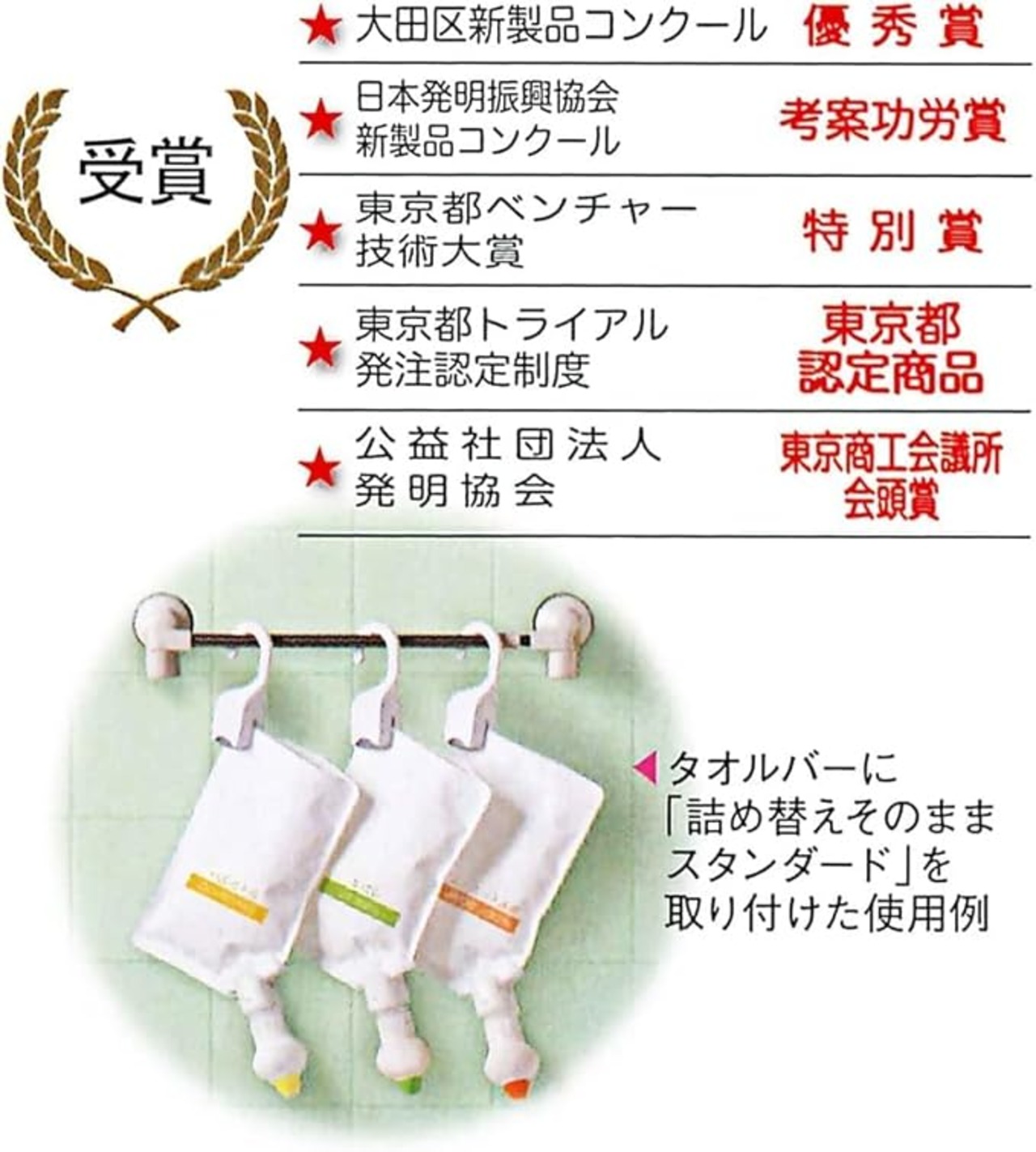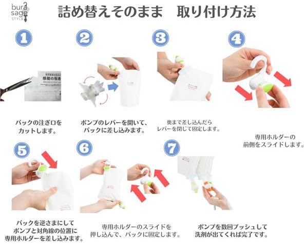 【特長】 ・シャンプーやコンディショナーの詰替え容器をそのまま使えるシリーズです。 ・ホルダーとポンプを詰め替えパックにセットするだけで、そのまま使用できます。 ・今まで面倒だった詰め替え作業がないので、取り付けたらそのままサッと使用できます。 ・ボトルを使わなくてすむので、お風呂場がスッキリします。 ・詰め替えの手間(洗浄、乾燥、補充)がないため便利です。 ・取り付け、取り外しは、簡単ワンタッチでできます。 ・片手で適量が抽出でき、赤ちゃんとの入浴時にも便利です。 【使用方法】 (1)詰め替え用パックの出口を1.5~2cmの幅になるようにカットします。 (2)レバーを開いたポンプを根元までしっかり差し込んでください。 (3)レバーを閉じて固定します。 (4)ホルダーのスライダーを手前に引き、詰め替えパックの端をはさんで再びスライダーを押して固定して吊します。 (5)ポンプを押して使用できます。