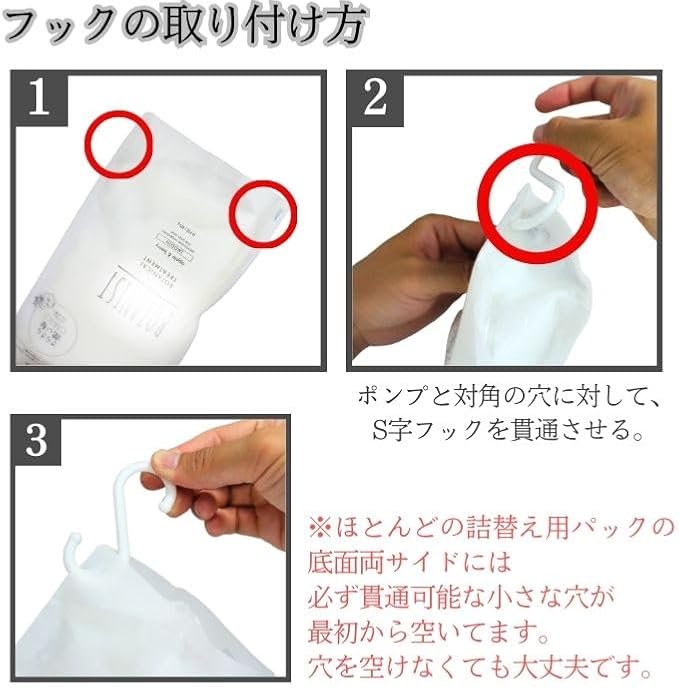 ①【簡単便利】 面倒な詰め替え作業不要。 詰め替えパックを簡単セットするだけでそのまま使える。 シャンプーリンスなどの詰め替えパックに取り付けることで使用することができる。
