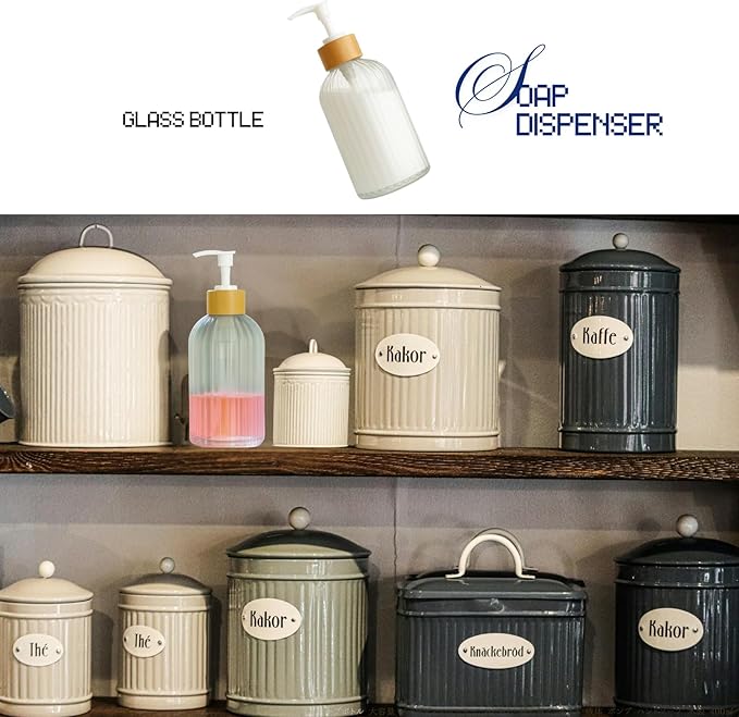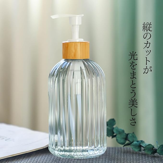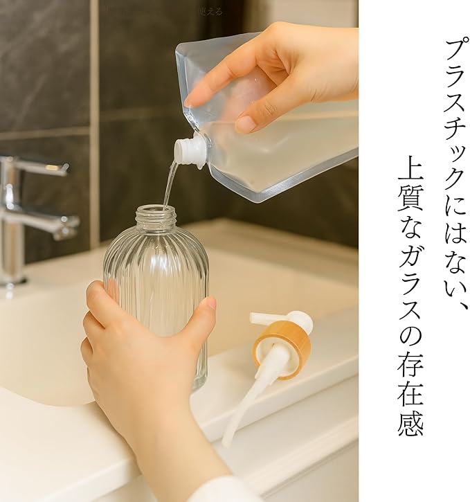 【見せる収納に映える透明ボトル】 クリアなガラスボトルは中身の残量が一目でわかるだけでなく、液体の色合いもきれいに見せてくれます。透明な美しさが映えるので、見せる収納やインテリア小物としても優秀。見た目と実用性を兼ね備えたディスペンサーです。