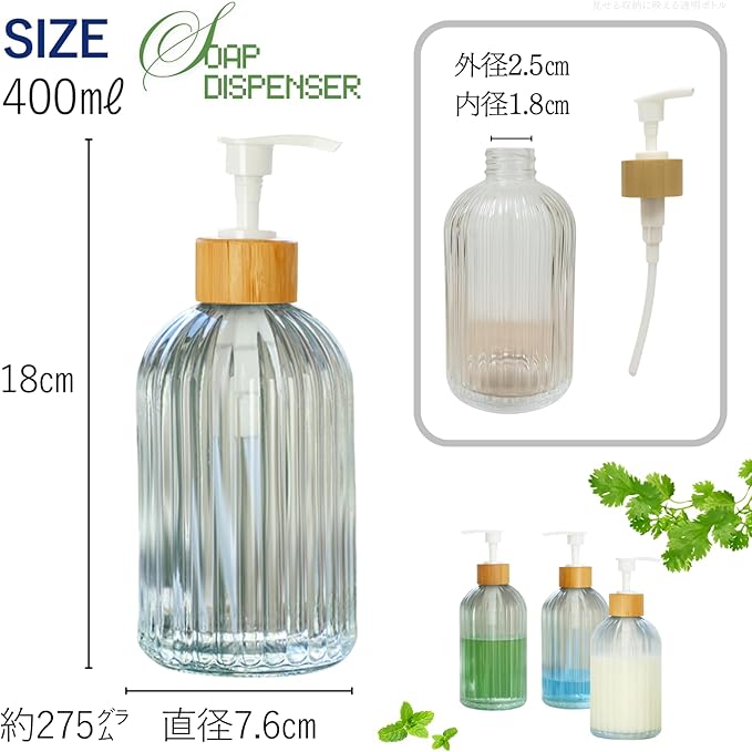 【木とガラスが織りなす上質な佇まい】 天然木の蓋と透明なガラスボトルが美しく調和したデザイン。自然素材ならではのやさしさと洗練されたシルエットが、洗面台やキッチンを引き立てます。 【空間になじむミニマルデザイン】 ロゴや装飾を省いたシンプルなフォルムは、生活感を抑えたい空間にもなじみます。素材そのものの美しさが引き立つため、雑貨や植物と並べても調和し、ホテルライクな清潔感のある印象を演出します。 【厚手ガラスで繰り返し使える】 厚みのある高品質なガラスを使用し、しっかりとした安定感と重厚感を実現。詰め替えて長く使えるため、使い捨てを減らし、環境への負荷も軽減。日常に取り入れやすいエコな選択肢です。 【約400mlのたっぷり容量】 容量は約400mlで、洗面所やキッチン、バスルームなどの各所で活躍。液体ソープや食器洗剤、ボディソープなど多用途に使え、詰め替えの手間も軽減。シンプルなデザインだからこそ、場所を選ばず使えます。 【見せる収納に映える透明ボトル】 クリアなガラスボトルは中身の残量が一目でわかるだけでなく、液体の色合いもきれいに見せてくれます。透明な美しさが映えるので、見せる収納やインテリア小物としても優秀。見た目と実用性を兼ね備えたディスペンサーです。