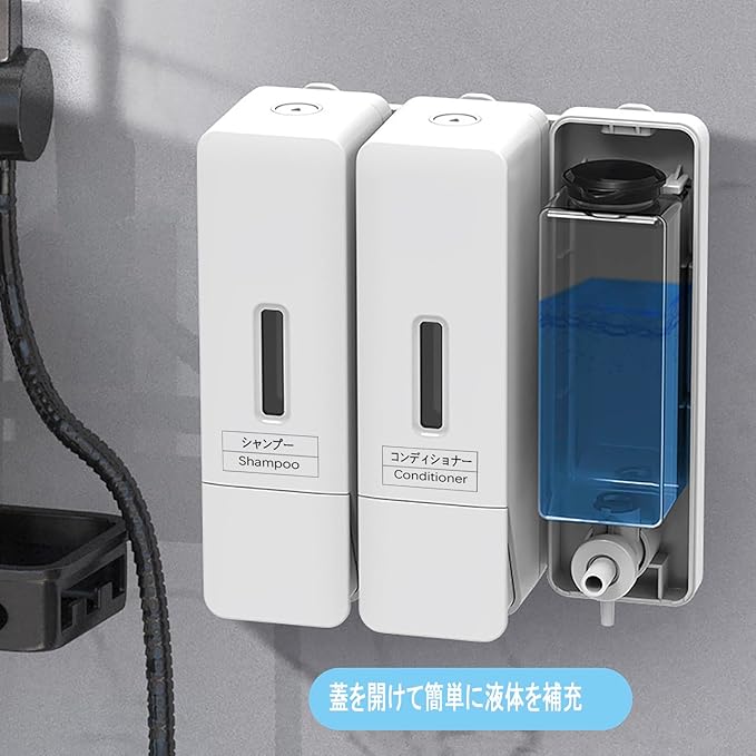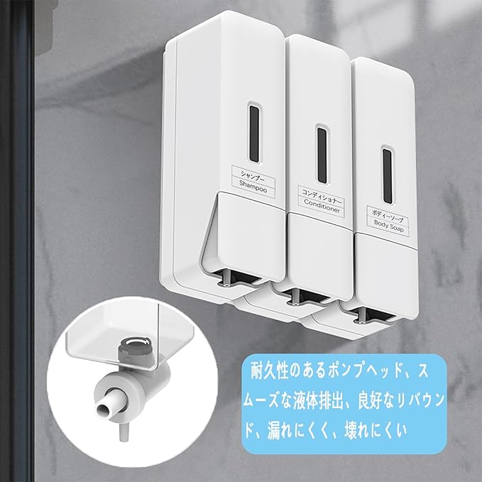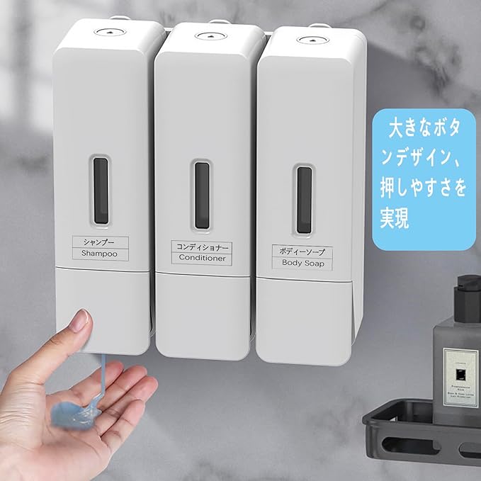 大容量ソープディスペンサーは、シャンプー、ボディーソープ、コンディショナーなど、さまざまな洗浄剤を同時に収納できる便利なアイテムです。各室340mlの大容量を誇り、家庭はもちろん、ホテル、美容院、病院、公共トイレなど、多様なシーンで活用できます。詰め替え頻度を大幅に削減し、忙しい日常でも安心して使用できる設計です。 使用上の注意: 無痕テープの取り付けに適した壁面タイプ: a. 滑らかなタイル/大理石 b. 硬質で滑らかなガラス c. 滑らかな金属 d. 滑らかな浴室用ミラー 無痕テープの設置に適さない壁面タイプ: a. コンクリート壁面 b. 壁紙壁面 c. 凹凸のある木目壁面 d. 凹凸のある金属壁面 e. 塗装壁面 f. 凹凸のあるタイル壁面 g. 珪藻土壁面 h. 凹凸のある大理石壁面 取り付け前に壁面の清掃を行い、接着面を乾燥させてから設置してください。 高粘度の液体を使用する際は、ポンプの詰まりを防ぐため、定期的にポンプ部分を清掃してください。 無痕テープを使用する場合、設置後24時間は荷重をかけないようにしてください。 このソープディスペンサーは、家庭から商業施設まで幅広く活用できる便利なアイテムです。大容量で詰め替えが簡単、耐久性も抜群で、長期間にわたって快適に使用できます。ぜひこの機会にご検討ください! よくあるご質問 Q:初回ご使用時にボタンを押しても液が出ません A:内部に空気が残留している状態です。排出穴を指で塞ぎながら数回ボタンを押す操作をお試しください。これで排液不良が解消されます。