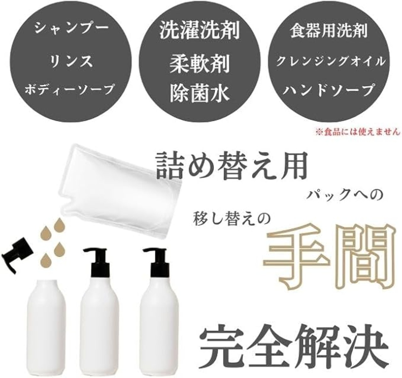 ①【簡単便利】 面倒な詰め替え作業不要。 詰め替えパックを簡単セットするだけでそのまま使える。 シャンプーリンスなどの詰め替えパックに取り付けることで使用することができる。