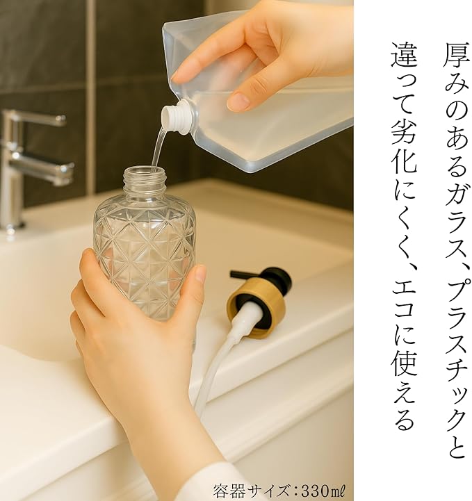【重厚感ある厚手ガラスでエコに使える】 厚みのある高品質なガラスを使用し、しっかりとした安定感と重厚感を実現。詰め替えて繰り返し使える仕様で、使い捨てを減らすエコな選択肢としても◎。デザイン性と実用性を兼ね備えた日用品です。