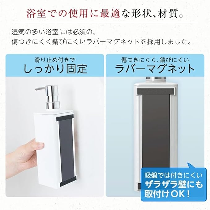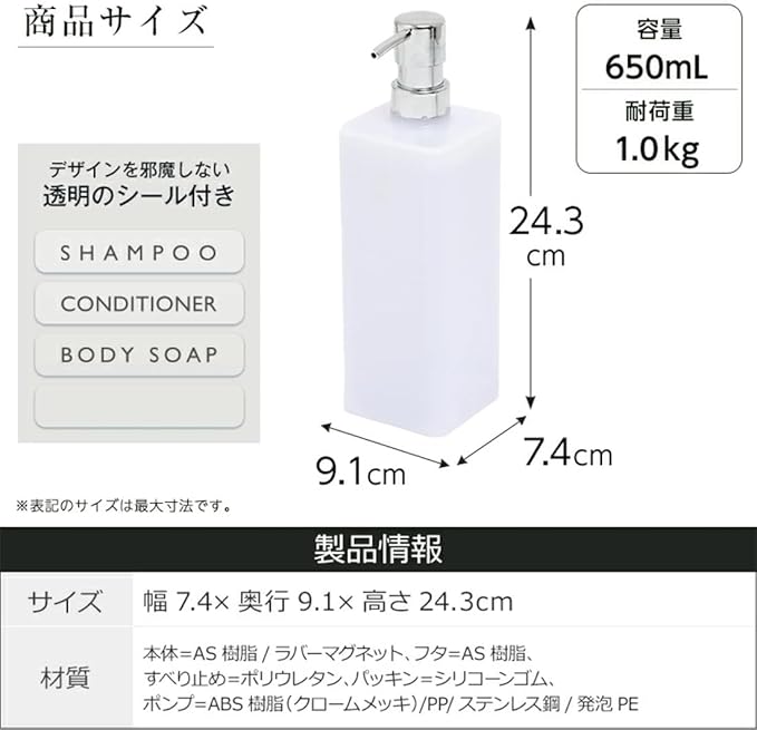 材質:本体/AS樹脂・ラバーマグネット、フタ/AS樹脂、パッキン/シリコーンゴム、すべり止め/ポリウレタン、ポンプ/ABS樹脂(クロムメッキ)・PP・ステンレス鋼・発砲PE