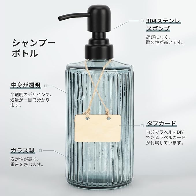 【頑丈なガラス製詰め替えボトル】本体ボトルは高品質で厚手のガラスで作られており、耐久性に優れています。透明なので、残量が一目でわかり、詰め替えの際に非常に便利です。