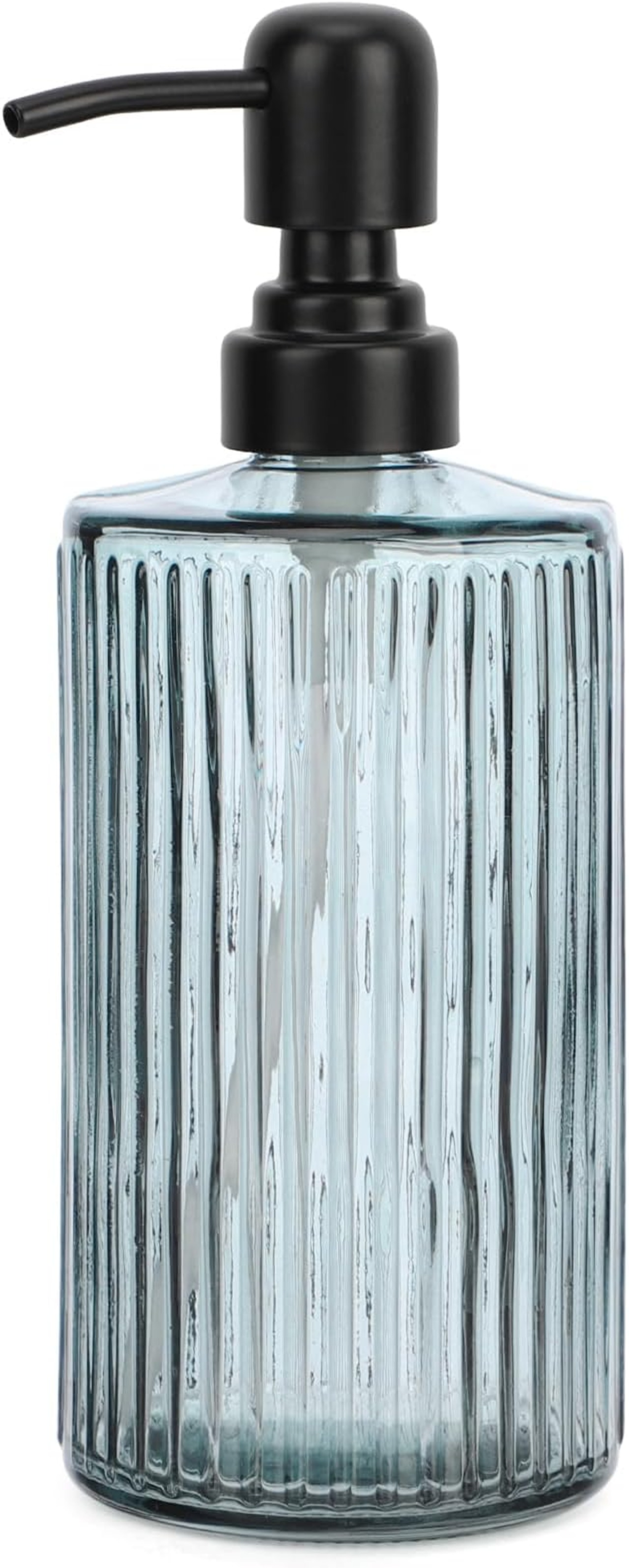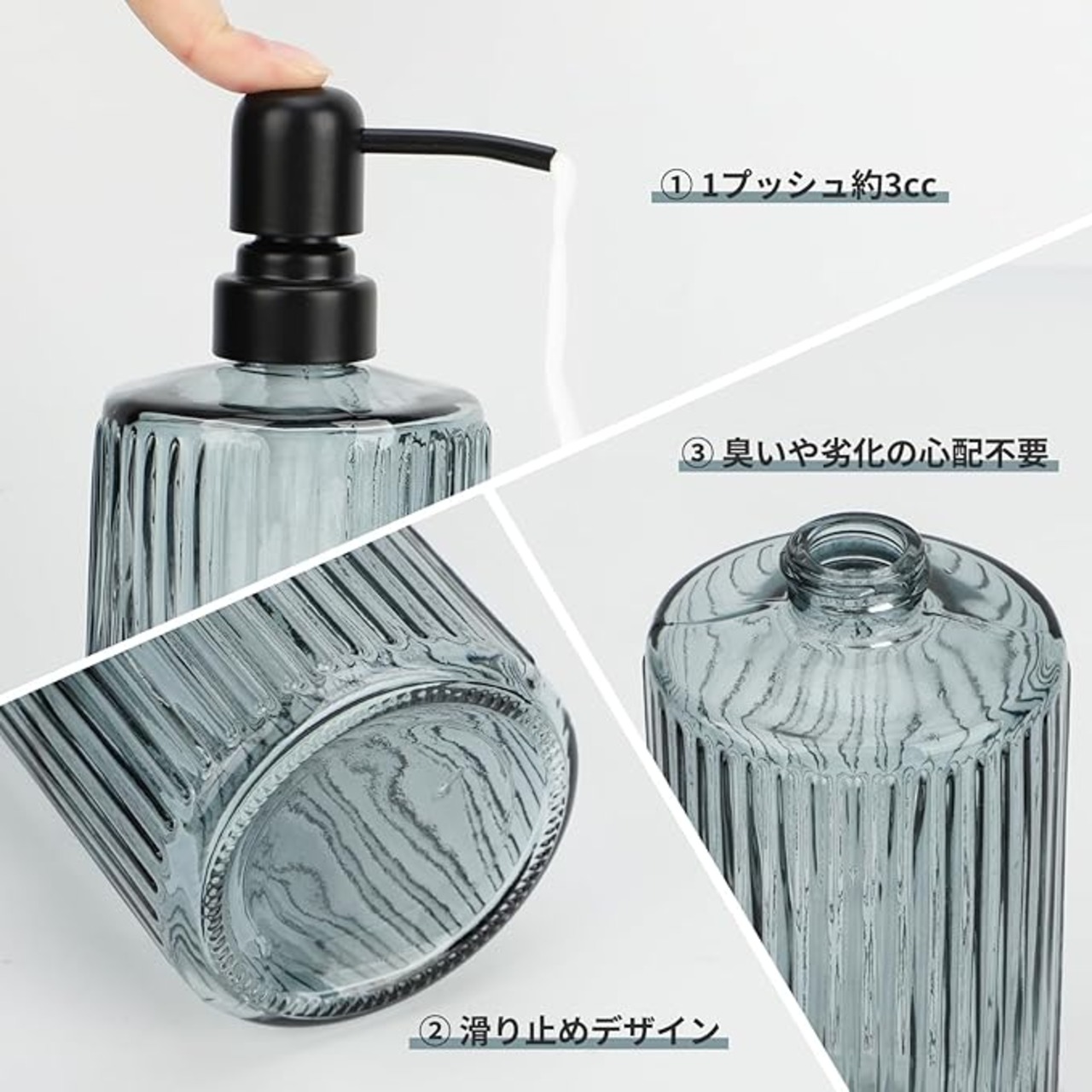 【製品仕様】幅7.5cm 高さ20cm、ガラス製。頻繁に触れる重要なポンプ部分には錆びにくい304ステンレスを採用し、製品の耐久性向上を目指しています。
