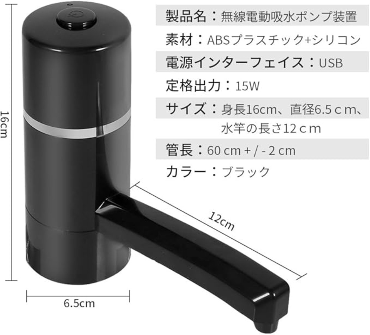【飲料水ポンプについて】素材:100 %飲料水品質のプラスチック+ステンレス、カラー:ブラック、重さ:435g、定格出力:15W、高さ:16cm、直径:6.5cm、ロッド長さ:12cm、管長:60 cm、パッケージ内容:USB充電線*1、ポンプ*1、ユーザーマニュアル*1。何か問題がありましたらお気軽にメールでスタッフにお問い合わせください。