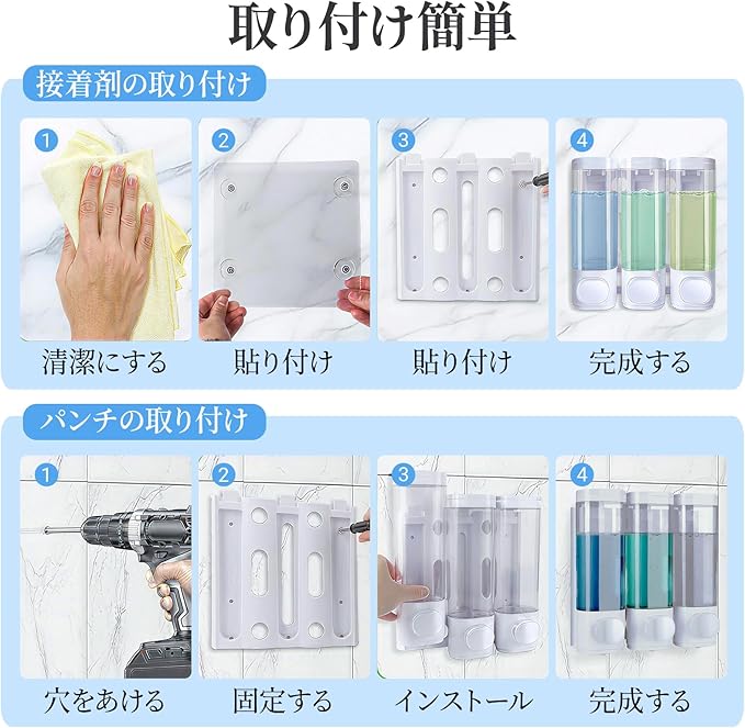 ✅【取り付け簡単】このソープディスペンサーは、パンチフリー設計で簡単に取り付けられます。1.壁をきれいにし、強力な粘着性の裏地を壁に貼り付け、数秒間押します。2.ソープディスペンサーの裏地を取り外し、ネジで強力な粘着性の裏地に固定します。3.ソープディスペンサーを上から下に挿入して、取り付けを完了します。
