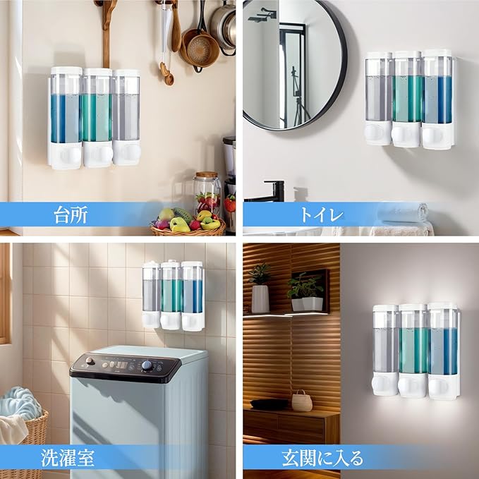 yowodana ソープディスペンサー【防水 防塵】液体ディスペンサー シャンプーディスペンサー 壁掛け 透明ボトル 片手 出液がスムーズ 非接触 パンチは不要 壁に損傷なし キッチン 洗面所 21.5x21cm (ホワイト 300ml x 3) | KAZESHOP