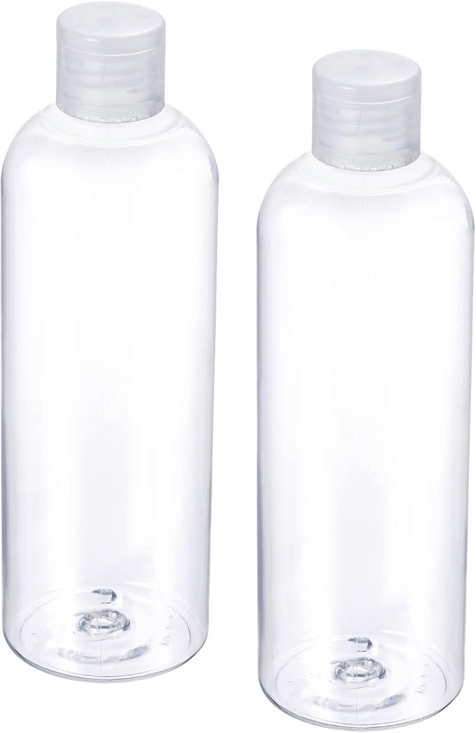 2個の旅行用ボトル。容量は300mlで、全体の高さは170mm、ボトルのサイズは55mm x 140mm(直径 高さ)、ボトル口の内径は18mmです。