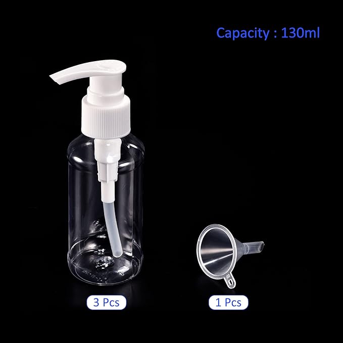 パッケージに含まれるもの:トラベルボトル3個とファネル1個、ボトルのサイズは45mm x 80mm / 1.77" x 3.15"(直径 高さ)、容量は130ml、ファネルの底部サイズは6.6mm x 18mm / 0.26" x 0.71"(直径 高さ)、ファネルの上部直径は30mm / 1.18"、ファネルの高さは40mm / 1.57"