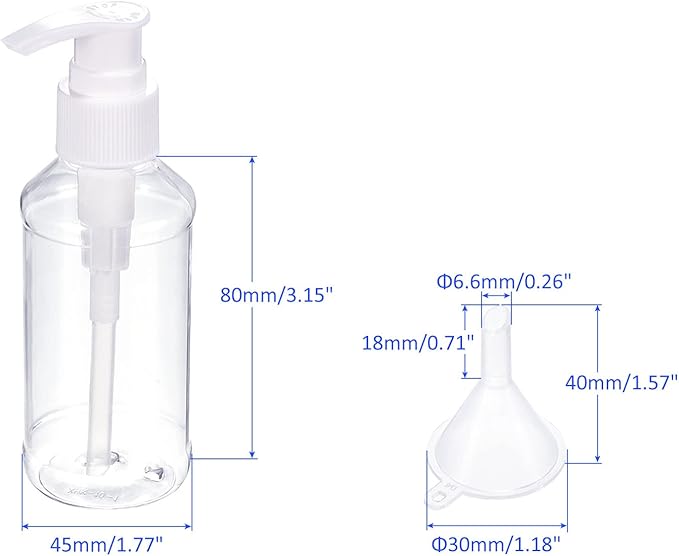 トラベルボトル3個とファネル1個、ボトルのサイズは45mm x 80mm / 1.77" x 3.15"(直径 高さ)、容量は130ml、ファネルの底部サイズは6.6mm x 18mm / 0.26" x 0.71"(直径 高さ)、ファネルの上部直径は30mm / 1.18"、ファネルの高さは40mm / 1.57"です。