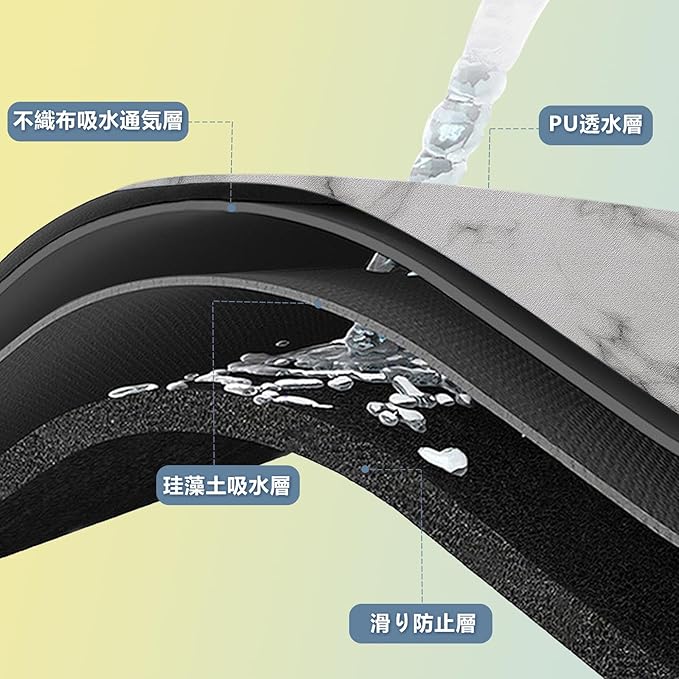 ★【吸水性・速乾性】ソフト珪藻土バスマットは 吸水力に優れ、お風呂上りの濡れた足元の水滴を逃さず、すばやく吸い取りします。超極細繊維PU透水層は通気性が良く、表面の水分が急速に蒸発し、速乾性に優れているので、湿気による細菌の繁殖も抑えます。