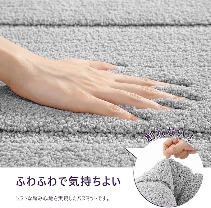 【ふわふわで気持ちよい】ソフトなマイクロファイバー素材で加工したこのバスマットは、ふかふかで、気持ちいい肌さわりを感じします。マットに立ち上がると、ソフトな毛が足裏を包んで、爽やかで、踏み心地がいいです。そして、冷たくなくて、床の寒さを感じしません。一日中の疲れをすば早く解散します。