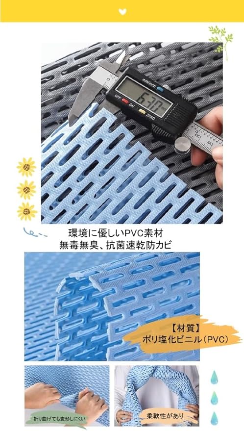 【材質】ポリ塩化ビニル(PVC);環境に配慮した無毒・無臭のPVC素材を使用しており、抗菌性・速乾性・防カビ性を備えています。