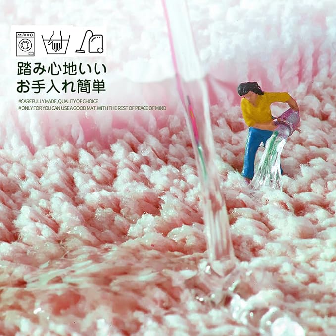 【肌に優しい】ふわふわな肌触りで、踏み心地がよく、シャワーの後に雲を踏むような感覚を味わえるので、お風呂上がりの足元に嬉しいバスマットです。使用後は洗濯機に入れてあとは形を整えて陰干しするだけできれいになります。