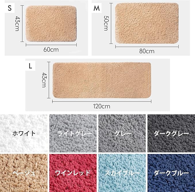 【毛長38mm! 柔かくて暖かい、寒い季節に最適!】38mmの毛長は普通の市販バスマットより2倍長く!ふんわり安心できる素材を使い、毛足は肌触りのよい極細マイクロファイバー繊維で作られたタオル地、柔かくて暖かい、秋や冬に最適!毛足が長いので、水分をすぐに吸い取り、柔らかくて暖かい触感で足に優しい。抗菌防臭素材を厳選し、浴室、台所、トイレ、玄関などの多様なシーンに応じて、8色と5タイプのサイズが用意しております。ご家族の安心するため高品質な匂いなく、特殊色染める技術処理して色落ちにくい、長く使っても新品感ままです。