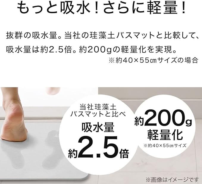 当社珪藻土バスマットと比べ重さも約200gの軽量化を実現。
