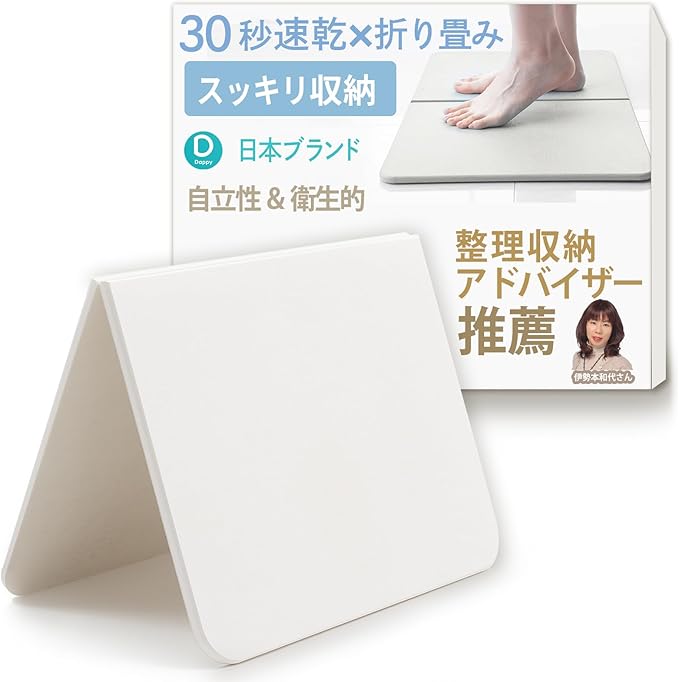 【整理収納コンサルタント推薦】Dappyの珪藻土バスマットはスタンドやマグネットが必要なく, 吸水と乾燥と収納が一つで完結する優れモノです。 濡れた足を載せた30秒後には,足形もなくなっている速乾性と床にも壁にも合うナチュラルなグレー。 まさに実用と外見の才色兼備な珪藻土バスマットをぜひお試しください。