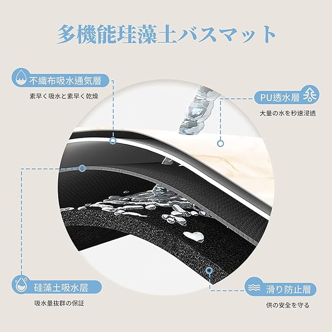【吸水性・速乾性】珪藻土バスルームマットはPUレザーを使用し、透湿性に優れています。2層目の不織布は吸水機能を持ち、染み込んだ水を素早く吸収することができる。3層目は最も重要な部分である珪藻土の層です、珪藻土バスマットに入っている珪藻土は、「呼吸する土」とも呼ばれます、調湿性能が高く、水分を素早く吸収し、素早く乾燥させることができます、家族3~4人が同時に使っても問題ありません。