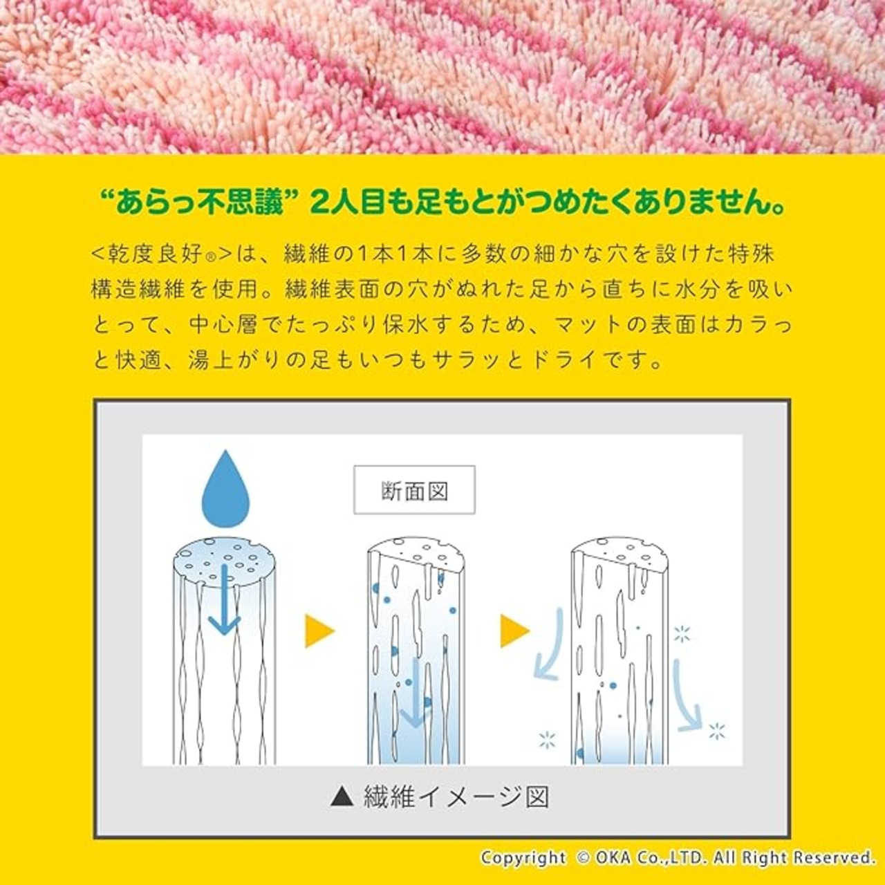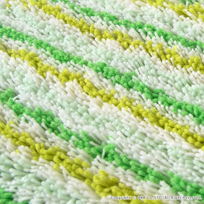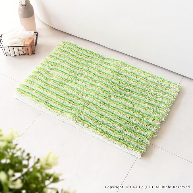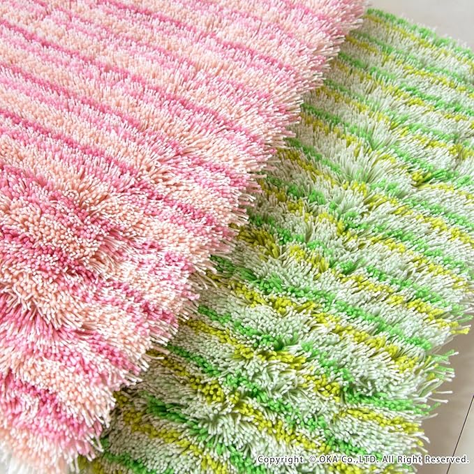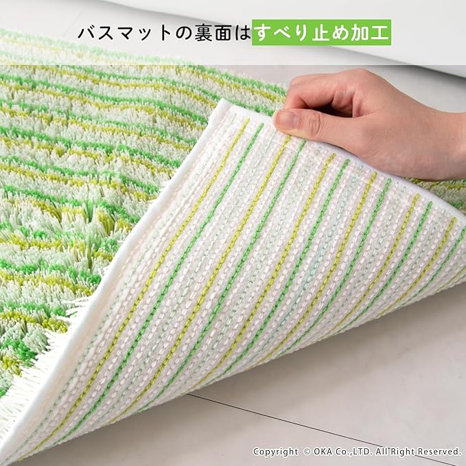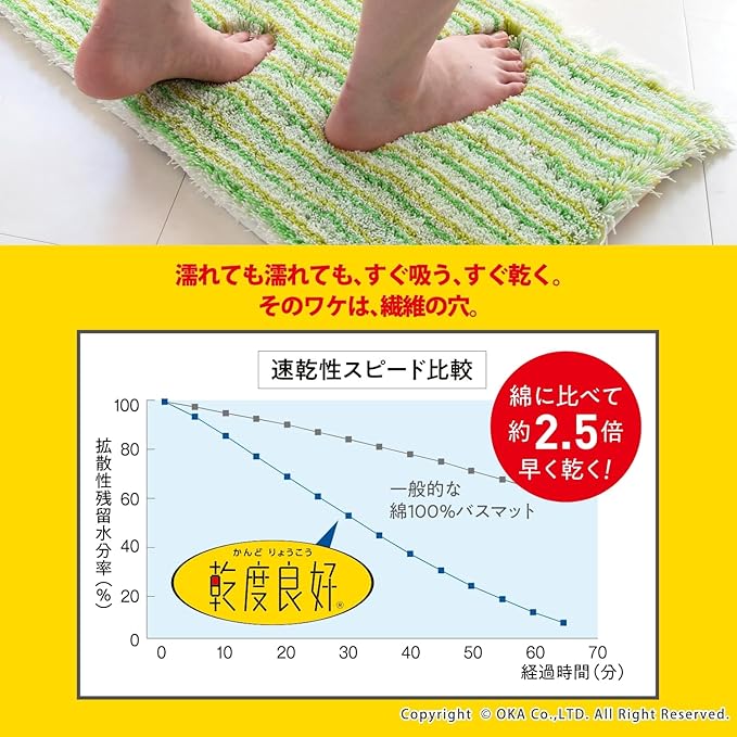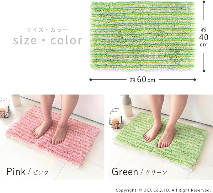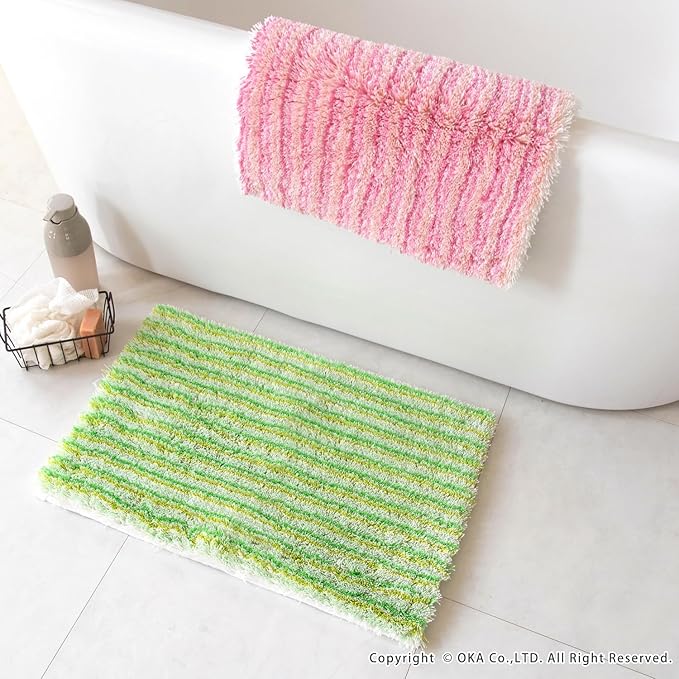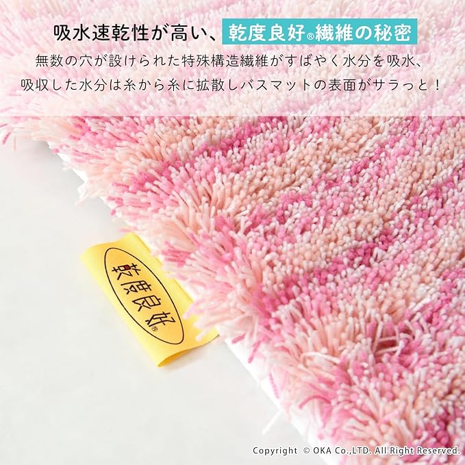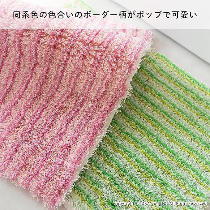 シリーズ販売30年以上続くロングセラー、2人目、3人目もびしょびしょしない!乾度良好Ⓡバスマット「乾度良好Ⓡアップフィールド」。濡れても濡れても、すぐ吸って乾くサラサラな乾度良好Ⓡバスマットは、家族が使ったあとのバスマットを使うとヒヤッとするお悩みを解決します。温浴施設などでもご利用いただき、おかげ様でたくさんの方にご好評のお声をいただき愛されています。特殊構造繊維を使用しているので吸水速乾に優れ、抗菌防臭加工付きの機能性にも優れた1枚です。それぞれ同系色のカラーで描かれたボーダー柄デザインが、ポップな印象で可愛い仕上がりになっています。バスルームや洗面所をパッと明るくしてくれる爽やかなピンク系とグリーン系の2色展開です。どこか懐かしい、レトロ感を感じさせる雰囲気で空間のアクセントにもなります。