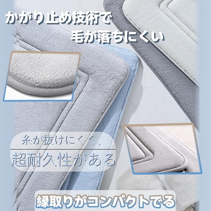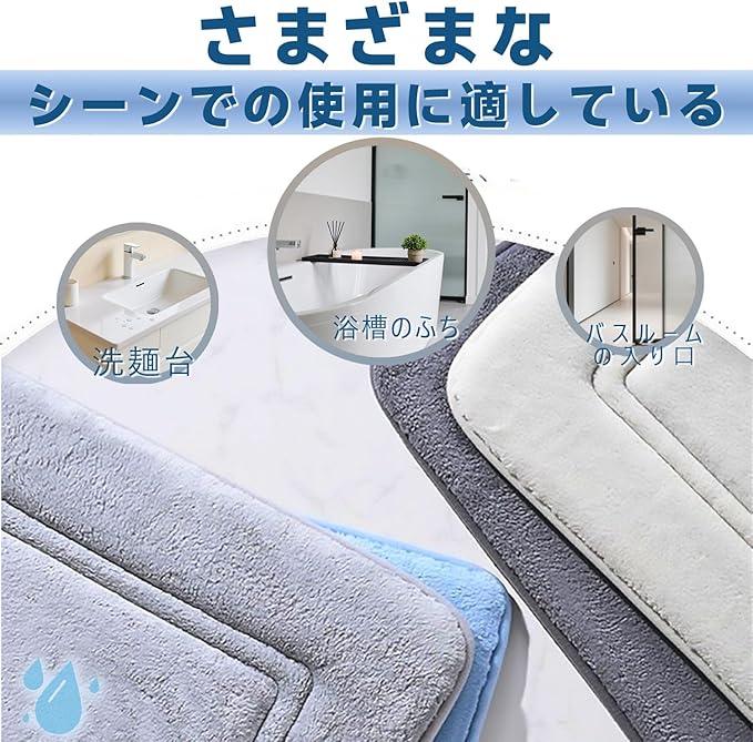 吸水力抜群のバスルームマットセット:セットには「U 型」のトイレマットと「長方形」の足マット(あしふきマット)が含まれ。お風呂上りに足拭きすると、水分を素早く吸収し、浴室をサラサラに保ちます。