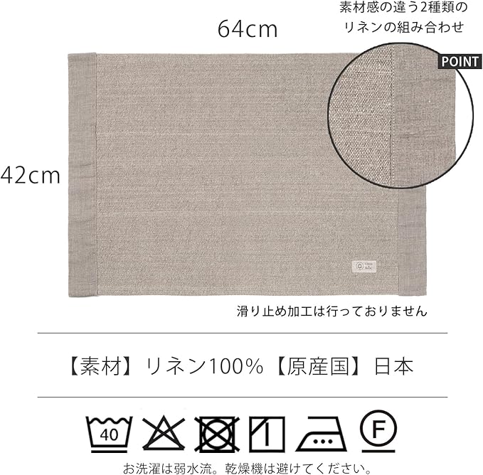 【サイズ】42 64cm【素材】リネン100%【原産国】日本【お手入れ方法】洗濯機でお洗濯できます。ネットに入れて弱水流か、手洗いでお洗濯可能です。脱水は短めにしてください。