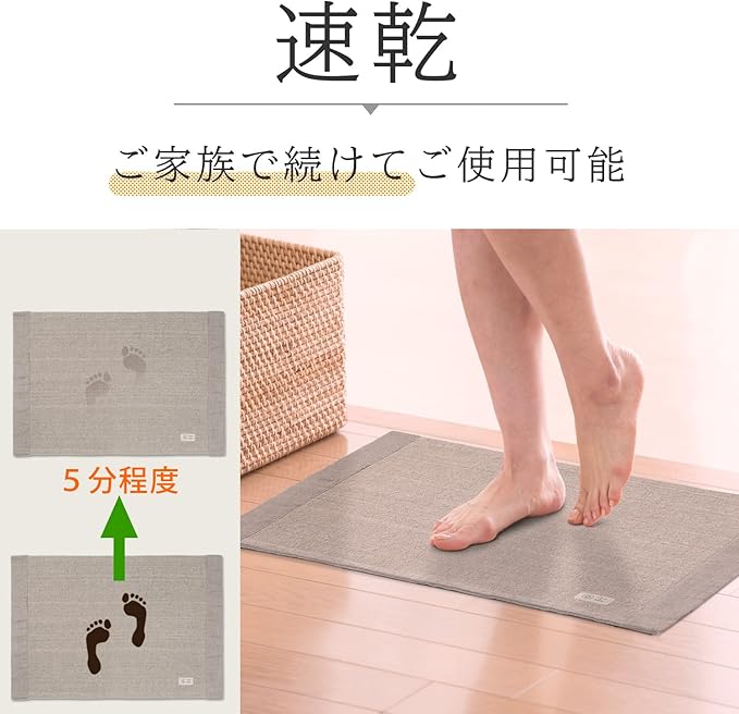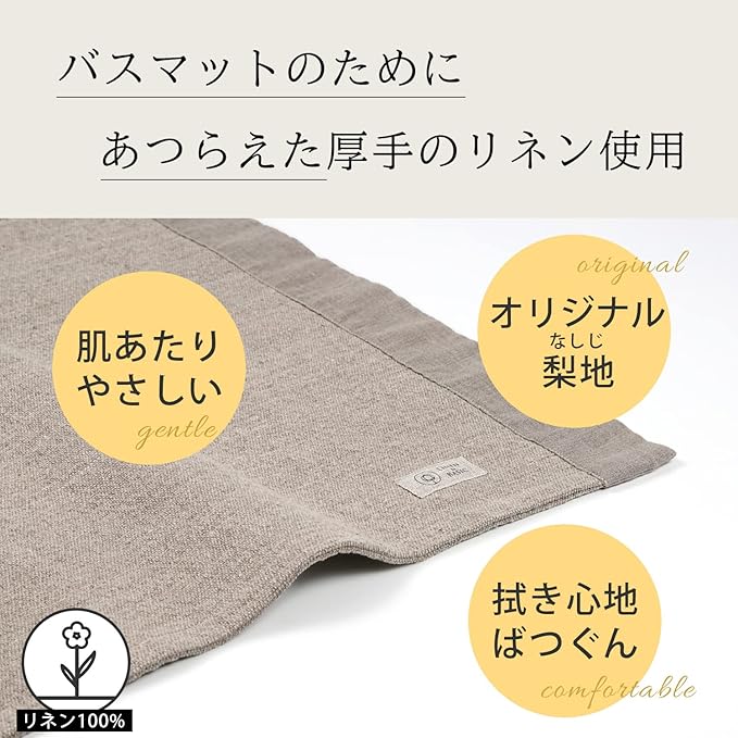 【拭き心地の良いバスマット】素材感の違う2種類のリネンを組み合わせたシンプルデザインのバスマットは、拭き心地に優れています。よく吸水したあと、とても早く乾燥しますので、ご家族で続けてご使用になる場合でも、吸水性が維持されていて快適です。