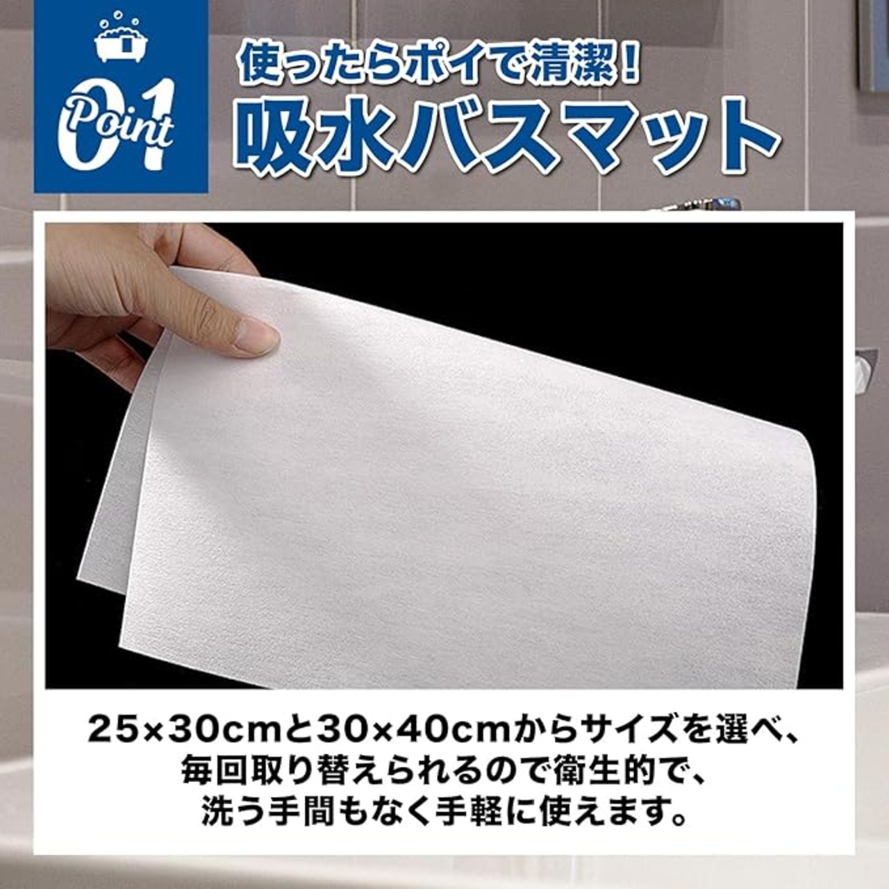 【吸水バスマットで手間なく快適】使い捨てタイプの吸水バスマット100枚。入浴後の足元の水分をサッと吸い取り、跡を残さず清潔に保ちます。25 30cmと30 40cmからサイズを選べ、家庭や宿泊施設など多用途に使いやすい仕様。毎回取り替えられるので衛生的で、洗う手間もなく手軽に使えます。