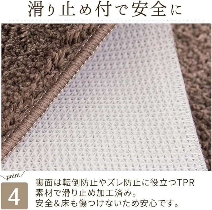 【滑り止め付き】裏面に滑り止めを施し、ズレや転倒を防止し、バスルームなど湿気や水気の多い場所でもご年配の方やお子様などの転倒防止や安全面もしっかりお守りします。また地面にフィットし、耐摩耗性材料を使用している為、水が滑り止め部分まで浸透することはなく床に対してもノンダメージでご使用頂けます。