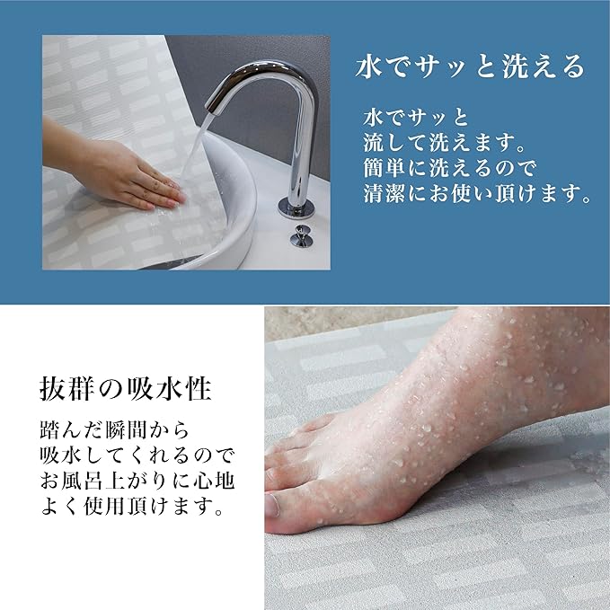足に優しい弾力性のある踏み心地。垂れた水分をしっかり吸水!水でサッと洗えてお手入れ楽々!割れる心配がないソフトタイプの吸水バスマット。