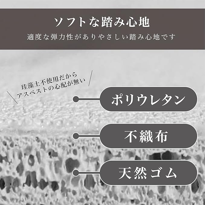 ポリウレタン・不織布・天然ゴムの3層構造で、垂れた水分をしっかり吸水!裏面は床に敷いてもズレにくいエンボス加工。