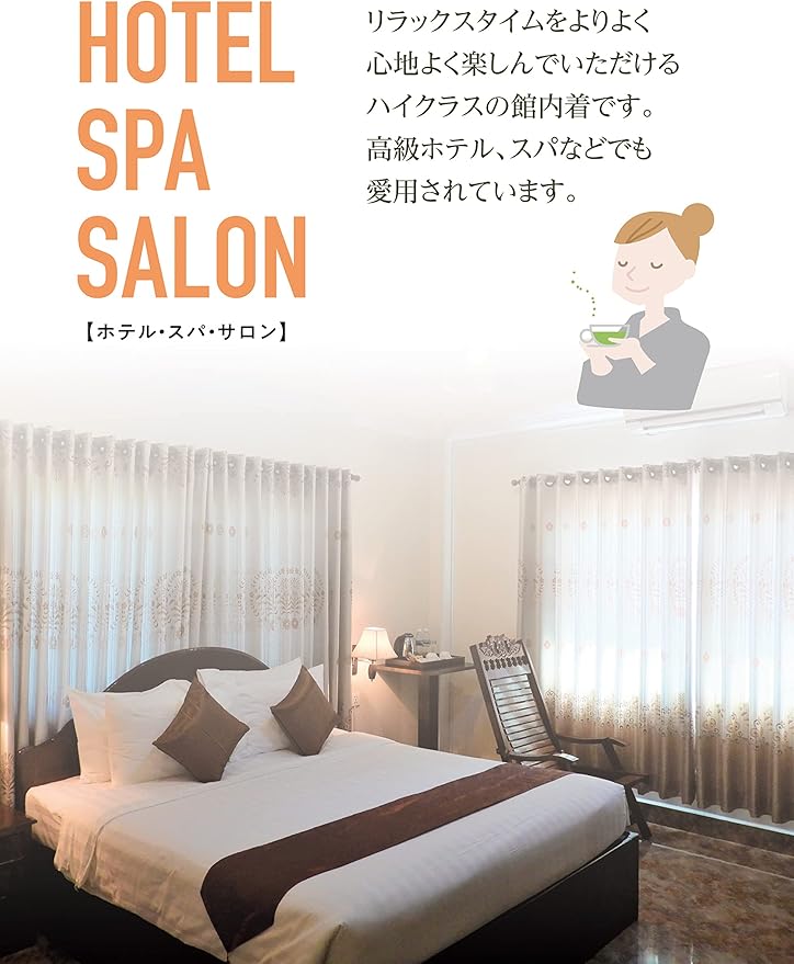 ・ホテルや旅館、スパ、サウナや温泉など、リラックスして過ごす空間にぴったりのウェアです。