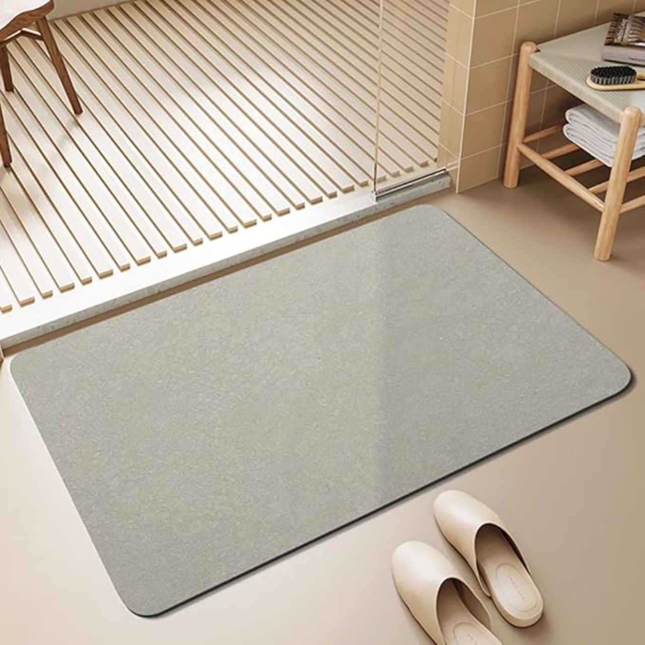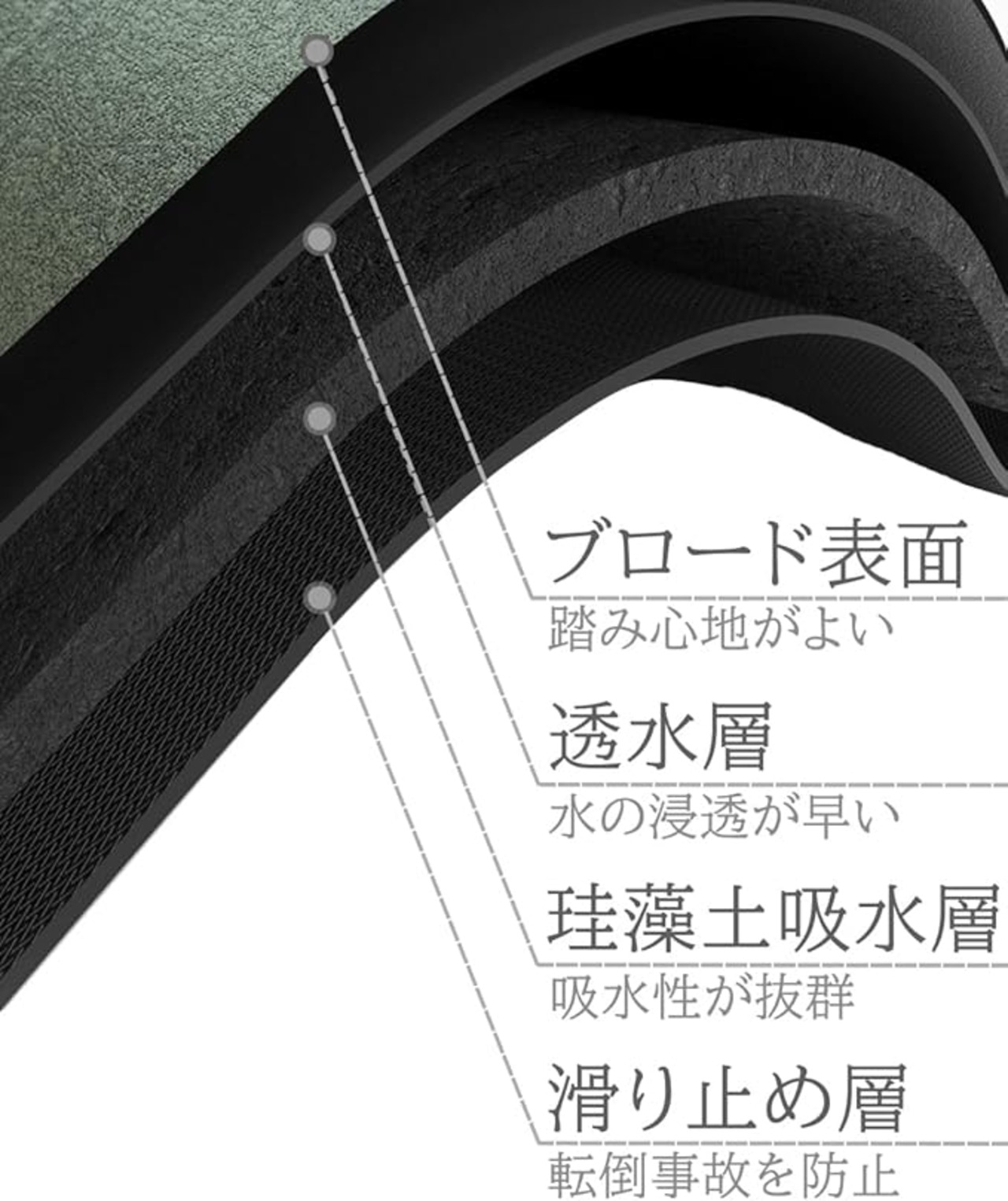 バスマットマットの表面のナノファイバーは水分を急速に蒸発し、速乾性に優れています。お風呂上りの濡れた足元の水滴を瞬時吸い取ってくれる。
